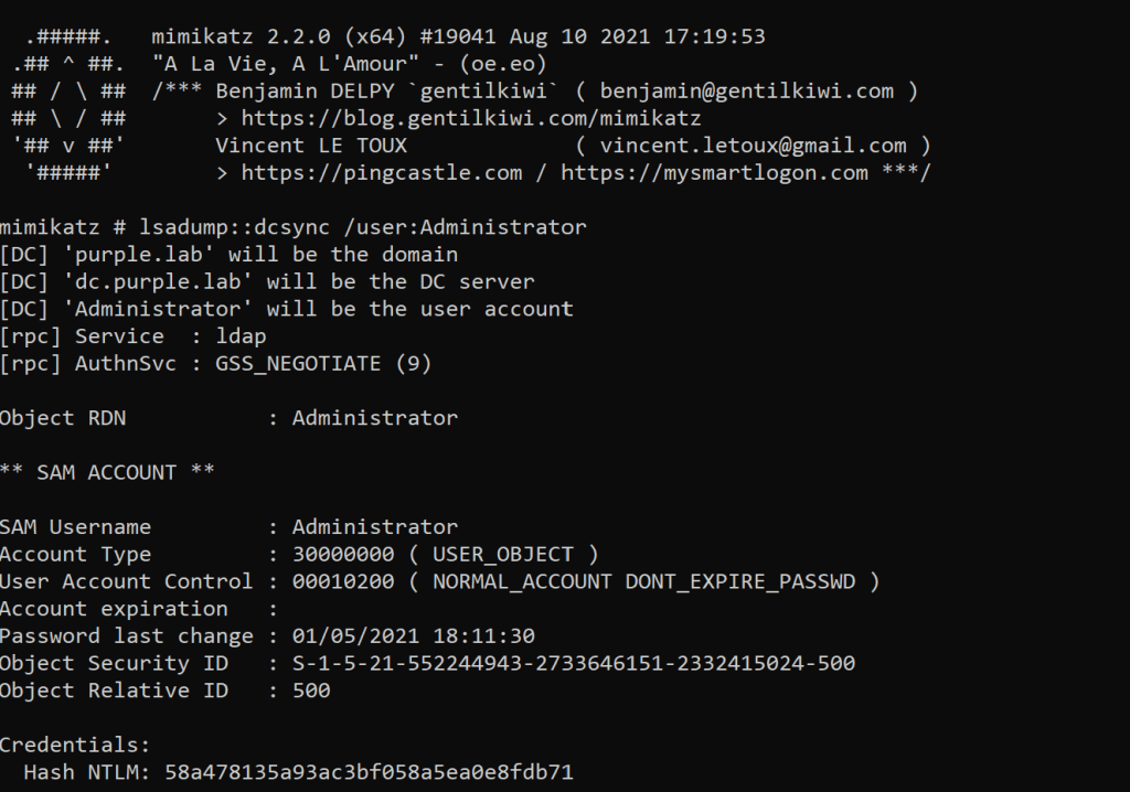 Since the ticket belongs to the machine account of the domain controller elevated activities could be performed such as DCSync. From the current session executing Mimikatz and running the command below will retrieve the NTLM hash of the user Administrator which is a domain administrator account.