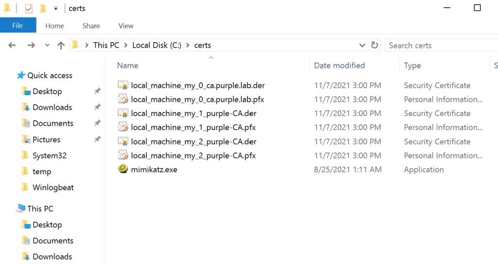 The certificates will be extracted in both .DER and .PFX format on the disk.