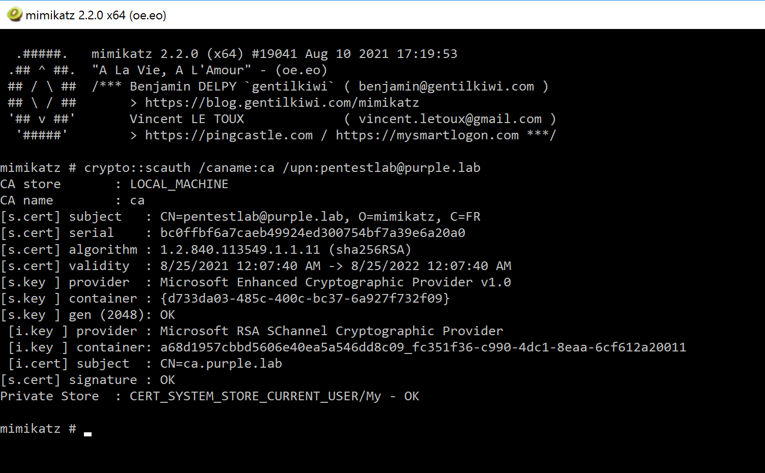crypto::scauth /caname:ca /upn:pentestlab@purple.lab