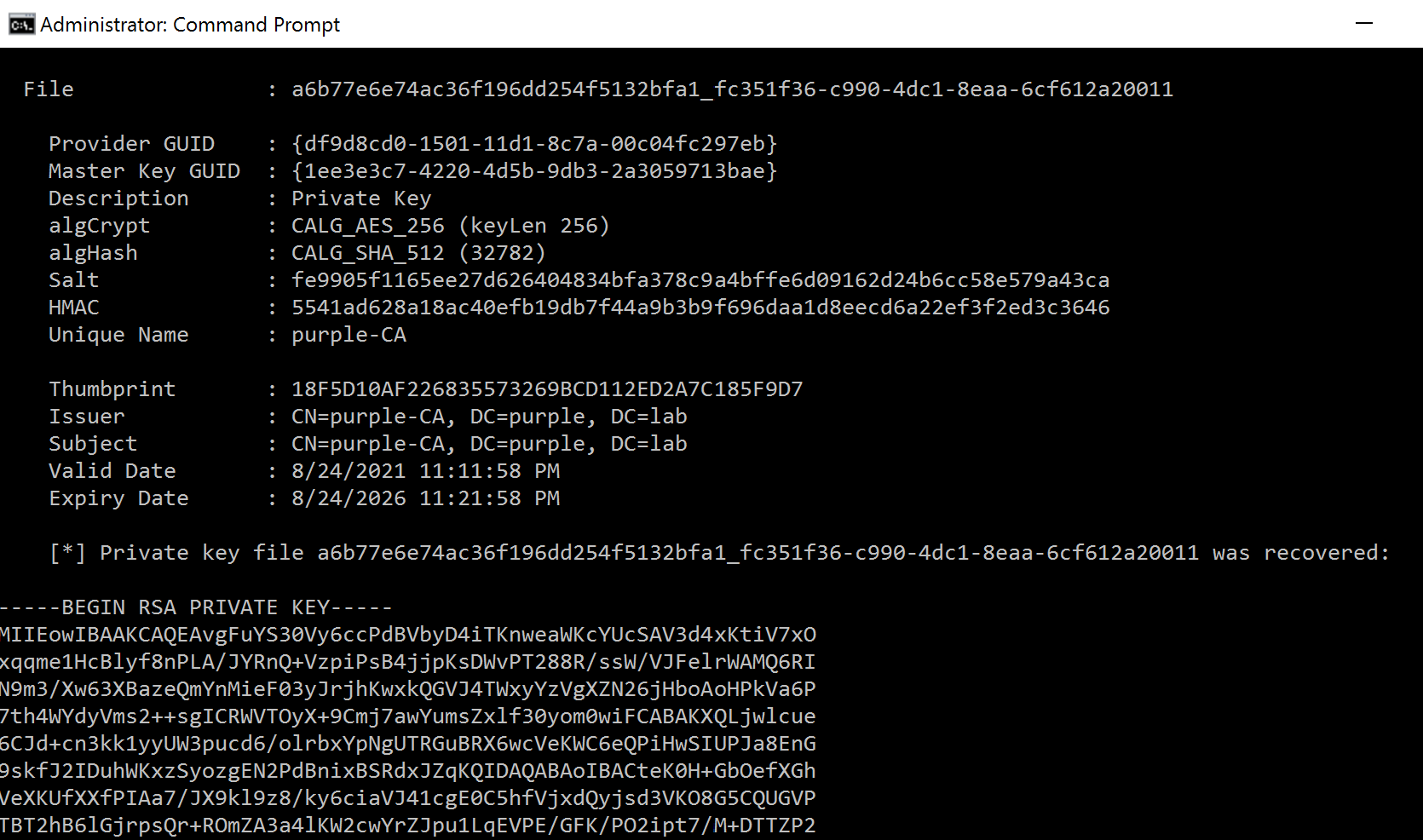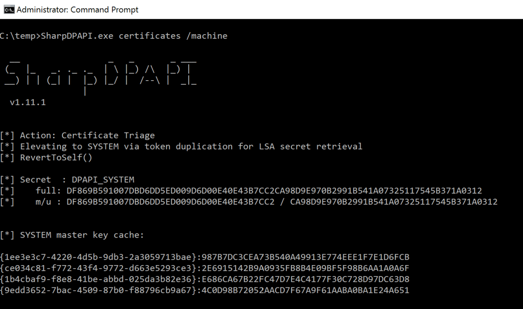 SharpDPAPI can be also used for extraction of certificates. Executing the “certificates /machine” command will use the machine certificate store to extract decryptable machine certificates and private keys.