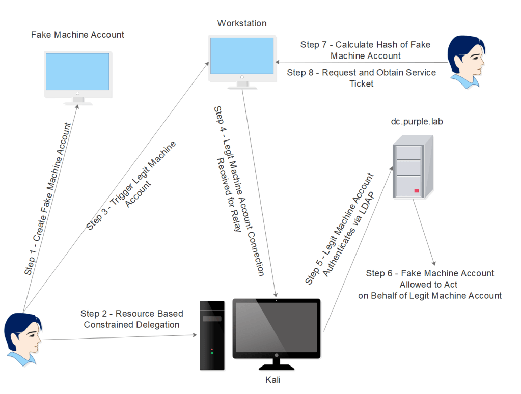 Elevation of privileges via Resource Based Constrained Delegation is not a new topic and it has been discussed in the past initially by Elad Shamir and Will Schroeder. This attack vector follows a series of steps and rely on the Service for User (S4U) Kerberos extension which enables a service (e.g CIFS) to request and obtain a service ticket on behalf of another user. The methodology of privilege escalation via Resource Based Constrained Delegation consists of the following steps: