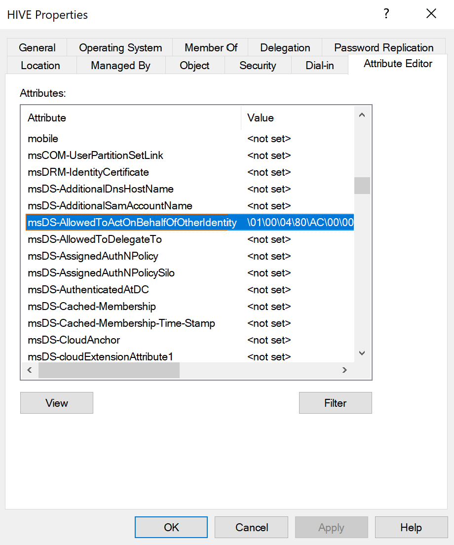A value which will correspond to the machine account which has delegation permissions will appear in the “msDS-AllowedToActOnBehalfOfOtherIdentify” attribute of the computer object (Hive).