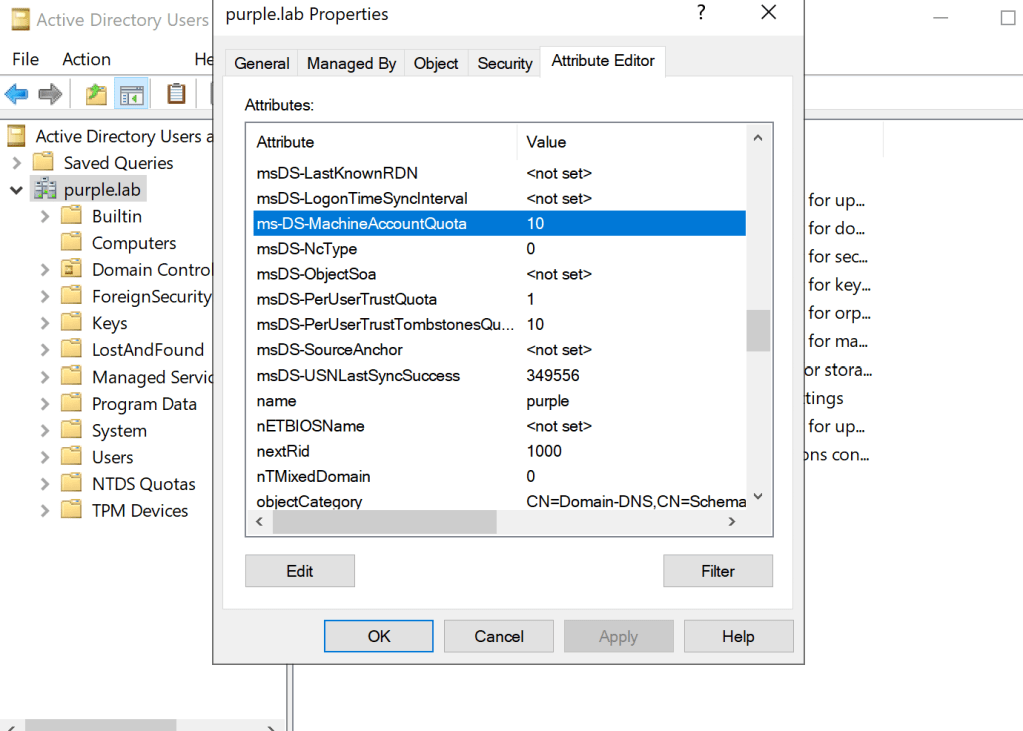 By default users on the domain are allowed to create up to 10 machine accounts. The value of the attribute “ms-DS-MachineAccountQuota” defines how many machine account can be created. From the perspective of Active Directory this can be observed by looking at the Attribute Editor in the domain properties.