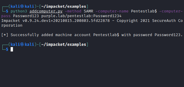 python3 addcomputer.py -method SAMR -computer-name Pentestlab$ -computer-pass Password123 purple.lab/pentestlab:Password1234