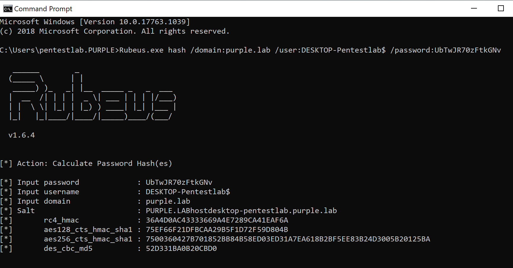 Rubeus.exe hash /domain:purple.lab /user:DESKTOP-Pentestlab$ /password:UbTwJR70zFtkGNv