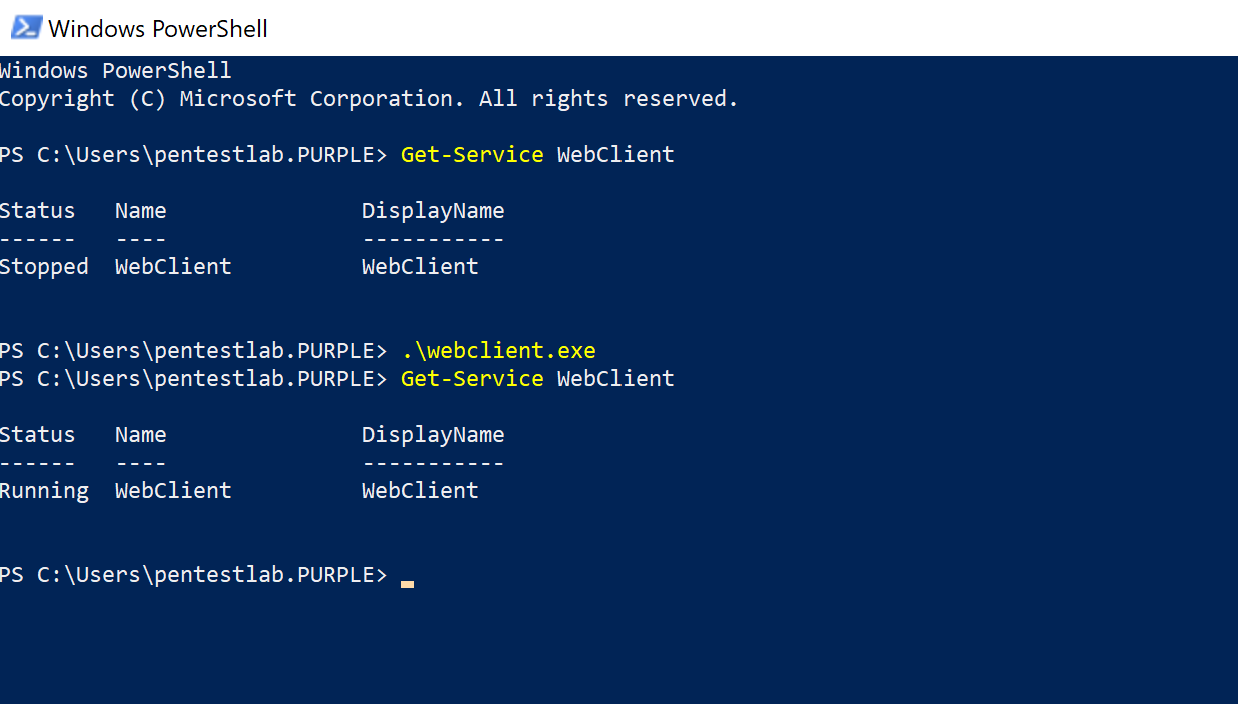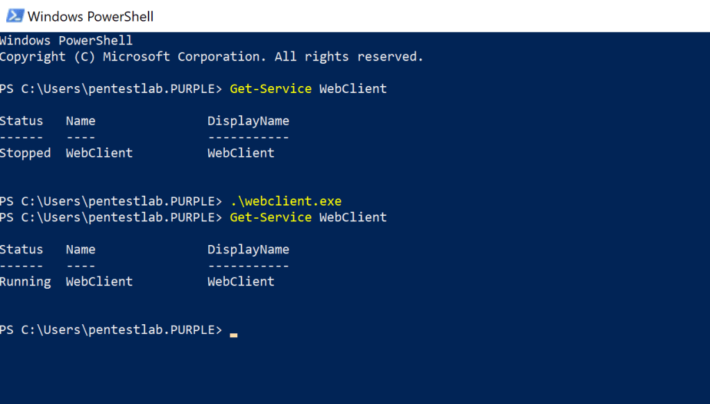 In newer versions of Windows operating system such as Windows 10 and 11 the web client service is installed but not enabled by default. The status of the service can be obtained by executing the following from a PowerShell console.