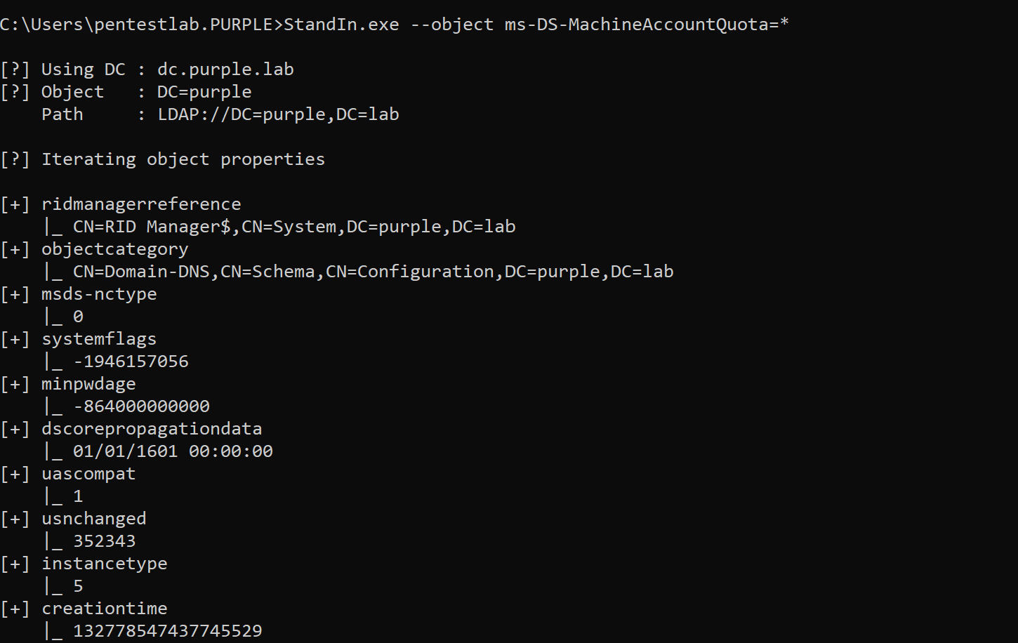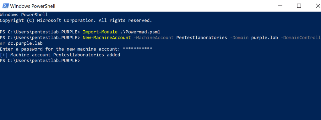 New-MachineAccount -MachineAccount Pentestlaboratories -Domain purple.lab -DomainController dc.purple.lab