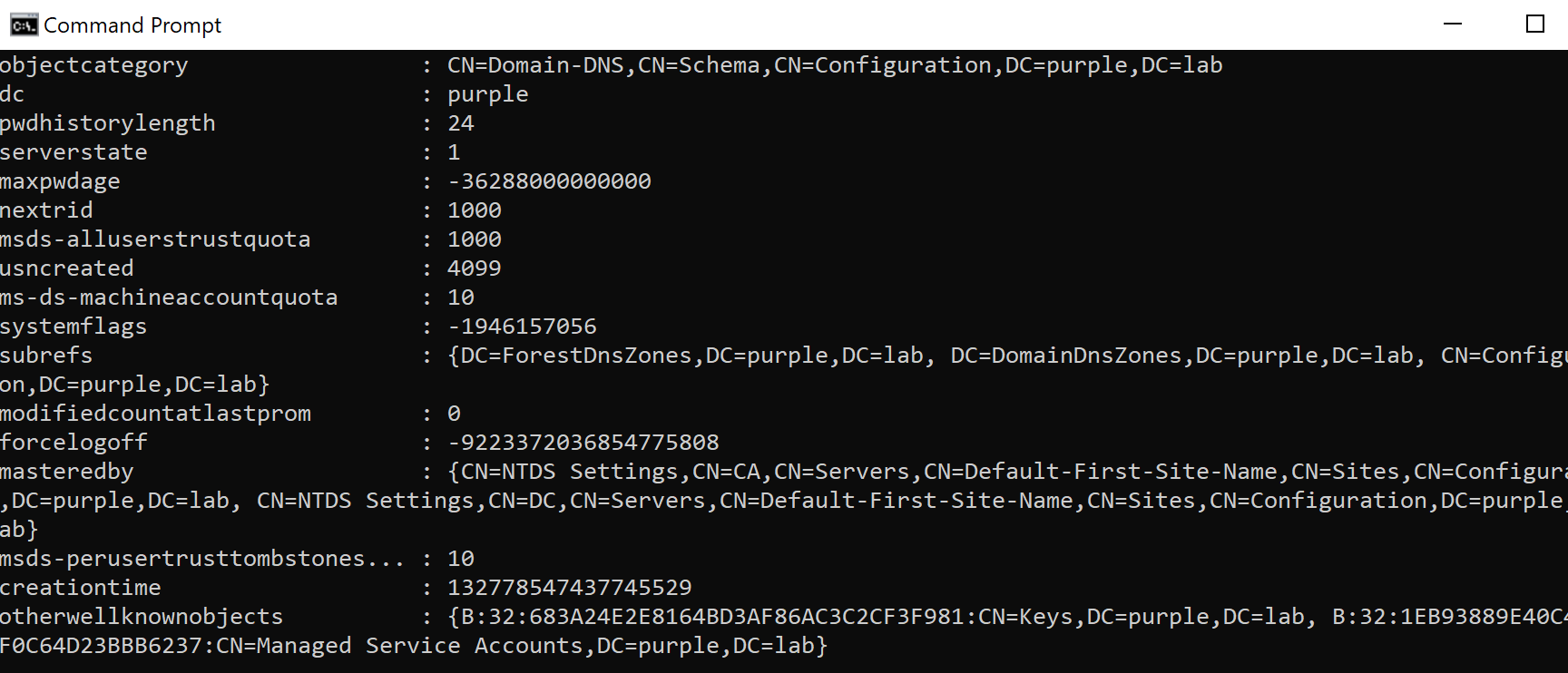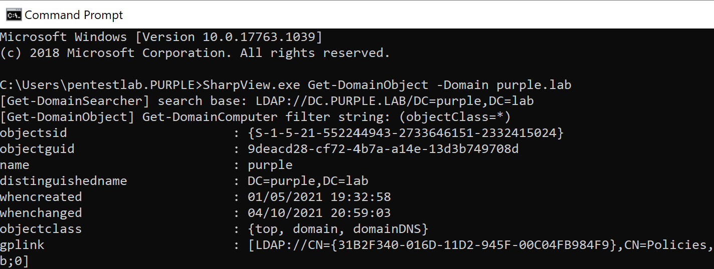 However, the above value can be retrieved by querying Active Directory objects during red team operations. SharpView is the equivalent of PowerView developed in C# and therefore can be used directly from the implant. Executing the command below will enumerate all the domain objects.