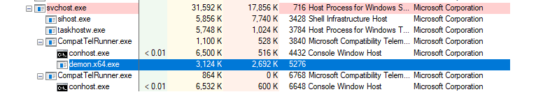 The implant will be executed under the context of “CompatTelRunner.exe” process.