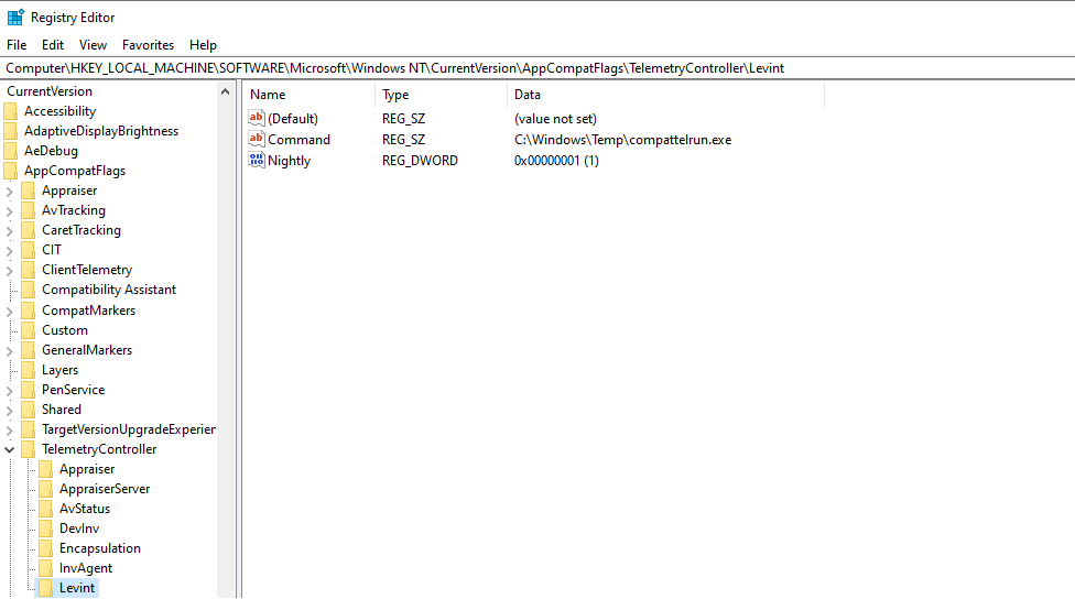 reg add HKLM\SOFTWARE\Microsoft\Windows NT\CurrentVersion\AppCompatFlags\TelemetryController\Persistence