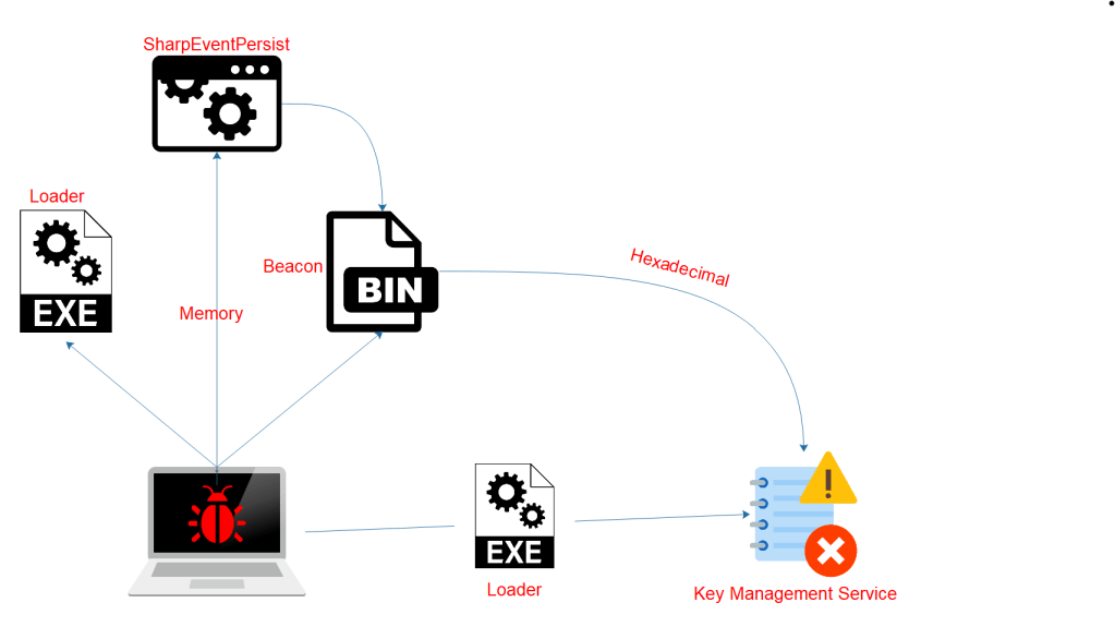 Since it is possible for an administrator to create event log entries and Windows Events are accepting binary data, it could be used as a storage of beacon during red team operations. The company Improsec developed a tool called SharpEventPersist which can be used to write shellcode into the Windows Event log in order to establish persistence. The shellcode is converted to hexadecimal value and it is written in the Key Management Service. Improsec, also released a secondary binary which acts as a loader in order to retrieve and execute the shellcode from the Windows Event Log. The following diagram displays the technique:
