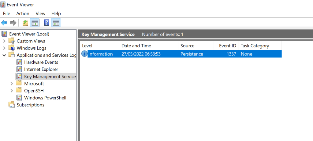 Once the SharpEventPersist is executed an entry will appear in the Key Management Service logs.