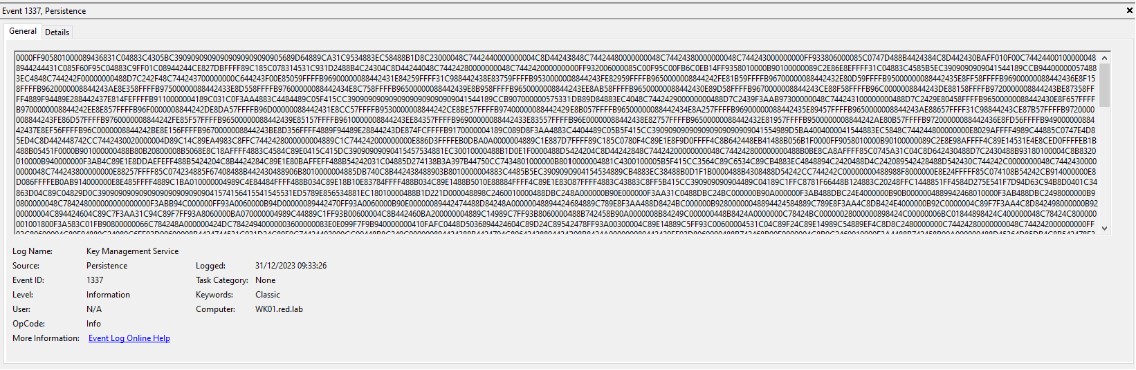 Write-EventLog -LogName 'Key Management Service' -Source KmsRequests -EventID 31337 -EntryType Information -Category 0 -Message 'Pentestlab' -RawData $HashByteArray