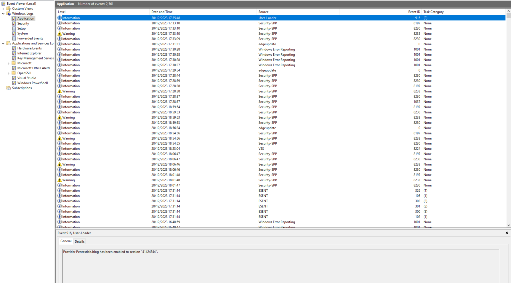 Write-EventLog -LogName "Application" -Source "Microsoft-Windows-User-Loader" -EventId 916 -EntryType Information -Message "Pentestlab.blog" -Category 2 -RawData 65,66,67,68