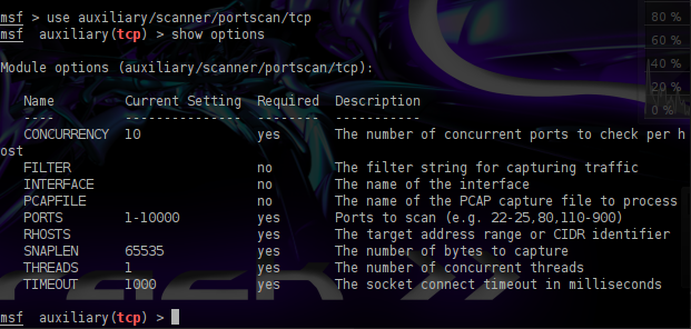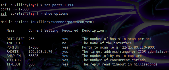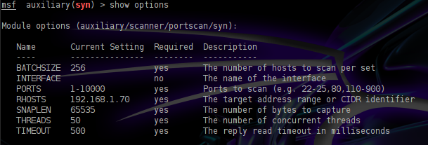 Before we type the run command that it will start the port scanning in the remote host we can use the show options command in order to see the available options and to check if all the settings are correct.