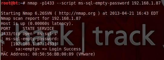 Now we know that the sa account has not a password.We can use this information in order to connect with the database directly or to continue to execute further Nmap scripts that require valid credentials.If we want to know in which databases the sa account has access to or any other account that we have discovered we can run the ms-sql-hasdbaccess script with the following arguments: