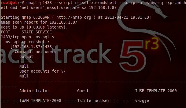In 2000 version of SQL Server xp_cmdshell is enabled by default so we can even execute operating system commands through Nmap scripts as it can be seen in the image below: