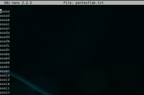 Now lets say that we want to create a wordlist that will contains the word pentestlab followed by 3 random characters.The command for that will be: