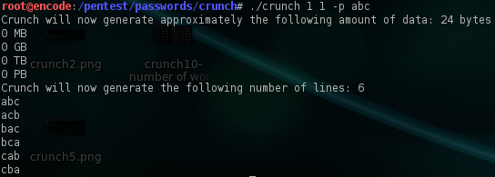 Here there are two options.First options is when we will want to generate something based on the characters of a word.For example ./crunch 1 1 -p abc will produce the following list: