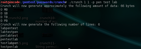 The second option is when we will want to create a list based on different words.For example the words blue and red can be bluered or redblue.We can achieve this with the command ./crunch 1 1 -p pen test lab
