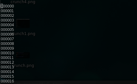 This will generate wordlists which will be 1Mb each and with 6 characters size and it will include the characters 0123456789.