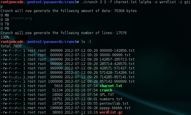Example: ./crunch 4 4 -f charset.lst lalpha -o wordlist -z gzip