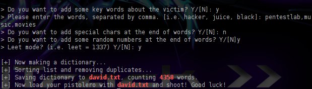 When we have as much information as possible for the interests,names,nicknames,hobbies etc of our victim it is time to use the cupp in order to fill in the information that we have for the creation of the password list.