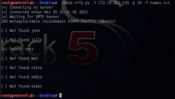 This is a python script that tries to connect on port 25 and performs automatic username enumeration through the vrfy command by supplying a .txt file with usernames.