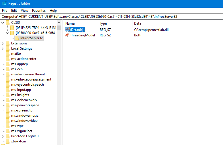 The “InprocServer32” (In-Process Server) registry key indicates where a COM library is located on the disk and defines the threading model. The image below demonstrate the registry keys that exist typically in “InprocServer32“.