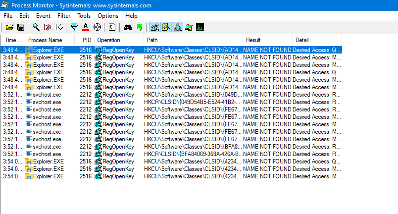 Identification of COM keys that could be used to conduct COM hijacking is trivial and requires the use of Process Monitor in order to discover COM servers which are missing CLSID’s and doesn’t require elevated privileges (HKCU). Process Monitor can be configured with the following filters: