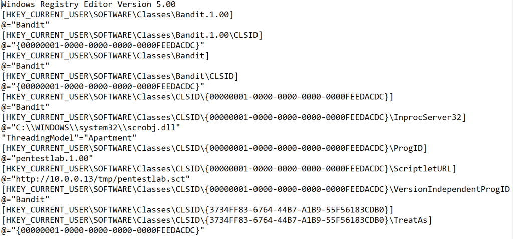 Casey Smith and Matt Nelson released a proof of concept as part of their presentation to demonstrate that a class could be called as well by its “ProgID” or by the “TreatAs” subkey to perform evasion. The following file can be used as an example.