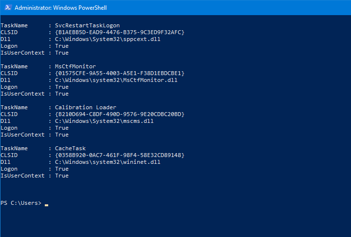 The parameter “PersistenceLocations” will retrieve schedule tasks vulnerable to COM hijacking that could be used for persistence and they don’t require elevated privileges. The CLSID and the associated DLL will also displayed in the output.