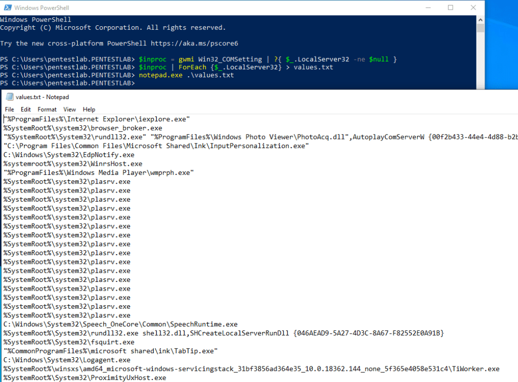 An alternative method is by executing the following PowerShell snippet as it has has been demonstrated by bohops in his article about Abusing the COM Registry Structure. This can be used to enumerate “LocalServer32” classes that could be hijacked: